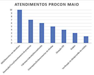 Os consumidores receberam orientação em 17 demandas em situação pendente, aguardando retorno. Permanecem em aberto, 11 demandas de abril, quatro de março e duas referentes ao mês de fevereiro. As demandas que ainda não foram resolvidas estão à espera de posicionamento das empresas. A atividade mais atendida foi em relação a descontos no Instituto Nacional do Seguro Social. (INSS).