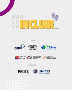O projeto Incluir-Itabira, coordenado pelo professor Fernando Guedes da Universidade Federal de Itajubá (Unifei), iniciou nesta quinta-feira (4) e segue até o sábado (6). Oportunidade para a comunidade participar de evento voltado à difusão das Libras (Linguagem Brasileira de Sinais), promovendo a valorização da cultura surda e ao fortalecimento da acessibilidade em nossa região. São várias atividades culturais, palestras e oficinas, com participação gratuita.