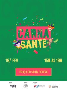 No dia 16 de fevereiro, o Carnaval será dedicado às crianças no Carna Santê, Bairro Santa Tereza, entre 15h e 19h. As atividades começam às 14h, com recreações e oficina de confecção de máscaras. Às 15h30, o concurso de fantasias incentiva a criatividade com a participação das crianças. Às 17h, o show de Yago Rios encerra a programação com música e alegria. O evento conta com espaço kids gratuito durante todo o período.