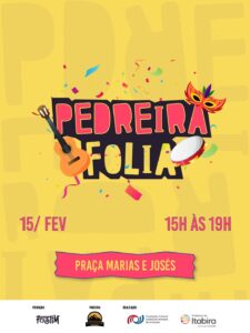 No dia 15, o “Pedreira Folia” será das 15h às 19h, na praça Marias e Josés, sede da Associação Comunitária. Às 15h, ocorre a abertura oficial e, em meia-hora, começam as gincanas com prêmios; às 16h, acontece a animada batalha de TikTok; às 16h30, o concurso de fantasias; seguido de muita dança com “Os Guri de Itabira”. O encerramento será às 18h com o Pagode do Alex. O evento conta com espaço kids gratuito.