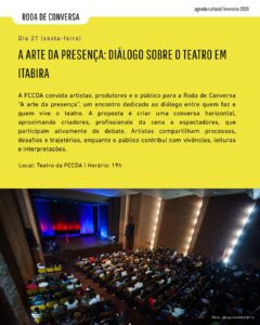 Quando o público conversa com os criadores, a obra ganha novas camadas de significado e cumpre melhor seu papel social, criando estratégias para atrair mais pessoas. “Um convite para estar presente, de corpo, voz e sensibilidade”, finaliza nota publicada pela FCCDA.