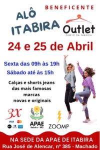 A Associação de Pais e Amigos dos Excepcionais (Apae) de Itabira realiza, nos dias 24 e 25 de abril, nova edição do seu tradicional bazar “Alô Beneficente”, com a venda de roupas novas e originais a preços acessíveis. Confira algumas das marcas: Shoulder, Calvin Klein, Ricardo Almeida, Brooksfield, Zoomp, Canal, Caution, Le Lis Blanc e Gregory, entre outras.